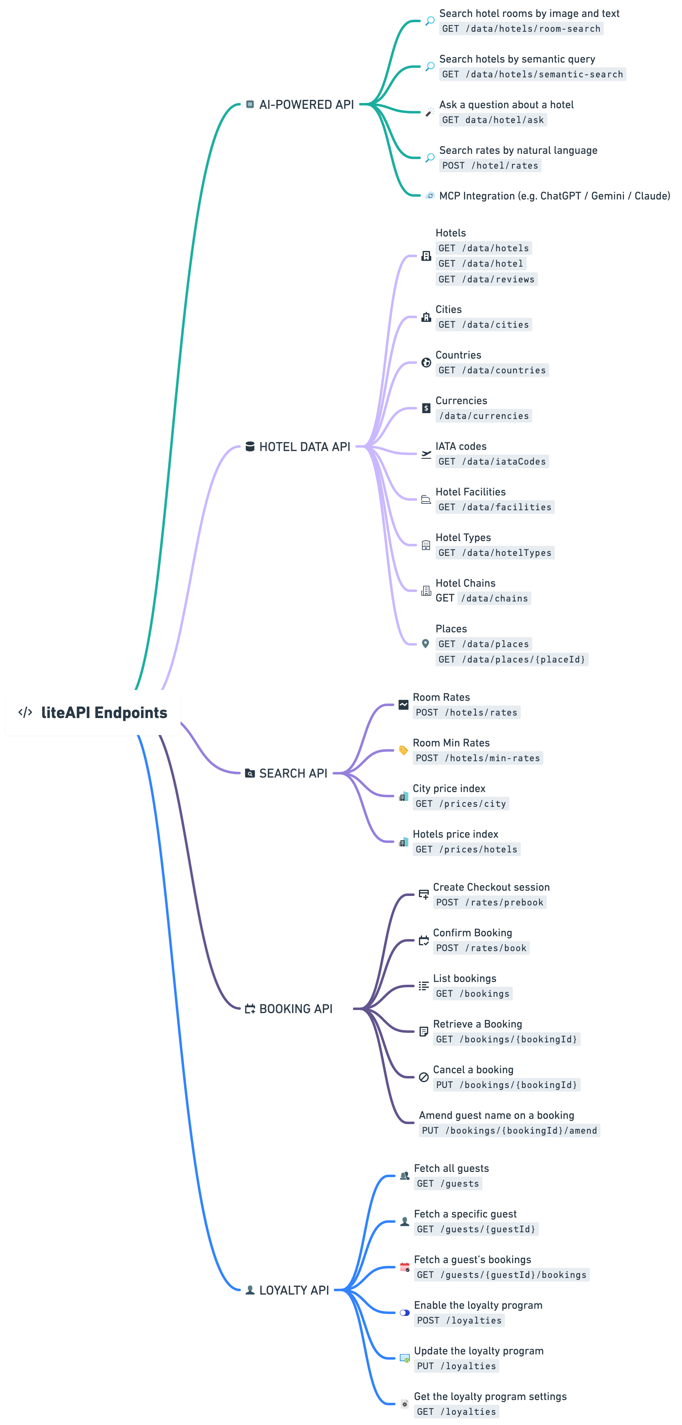 The provided diagram visually outlines the API endpoints available in LiteAPI v3, categorized into four main sections: Hotel Data API, Search API, and Booking API, Loyalty API.